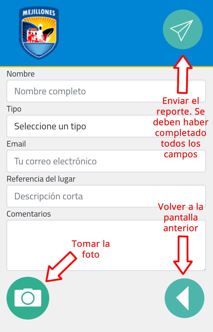 Todos los campos son obligatorios, se debe indicar el nombre de quién genera el reporte, el tipo de reporte, esto se define antes de la implementación de la APP, el correo electrónico del usuario. Una referencia del lugar, por ejemplo: “sitio eriazo al lado de multi cancha” y los comentarios que se estimen convenientes. Finalmente se debe tomar una foto usando el mismo teléfono y solo entonces se estará en condiciones de hacer click en el botón
